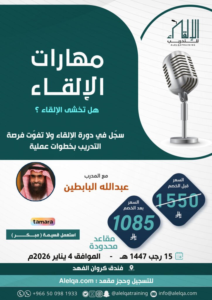 مركز الإلقاء للتدريب، تأسس عام 1419هـ/1999م تحت إشراف المؤسسة العامة للتدريب التقني والمهني، ليكون وجهة متميزة لتطوير المهارات الإلقائية وتنمية القدرات التأثيرية والإقناعية. نسعى لاكتشاف القدرات الكامنة لدى الأفراد وتمكينهم من توظيف مهاراتهم في حياتهم العملية والمهنية. يركز المركز على التدريب التطبيقي من خلال برامج تجمع بين الجوانب النظرية والعملية. بخبرة تتجاوز 532 برنامجًا تدريبيًا، نساهم في إعداد شخصيات مؤثرة وفعّالة في المجتمع. رؤيتنا هي بناء مجتمع ملقٍ مبدع وشخصيات قادرة على الإقناع والتأثير.